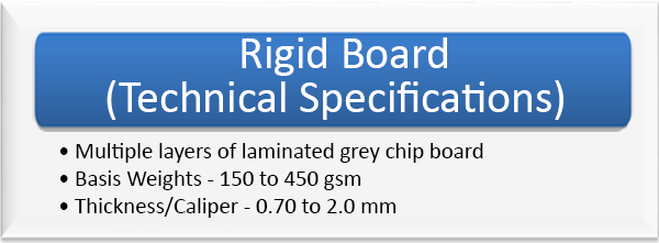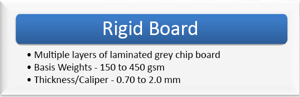 Rigid board is manufactured by laminating two or more layers of grey chip board with high strength glue to the desired thickness.This board is available in sheet form.